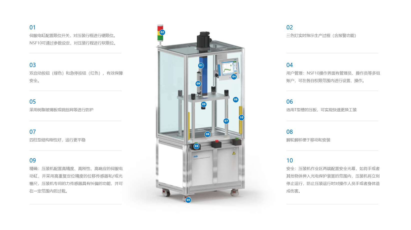 电子压机的主体部分包括:伺服电缸、伺服电机、伺服驱动器、NSF10监测及力和位移传感器等完善的伺服压装系统,配套外围的电气件、结构件、框架等可形成一套完整的伺服压装机。